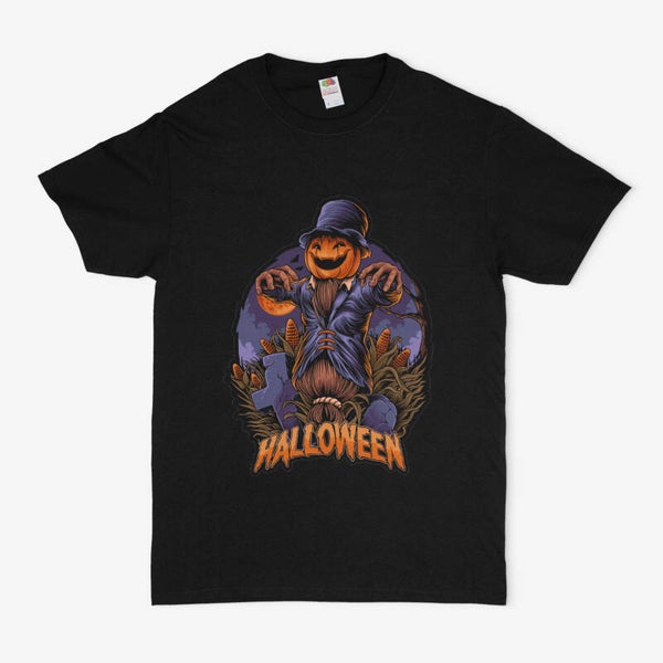 Een griezelig t-shirt met een afbeelding van een spooky Pumpkin vogelvershrikker.