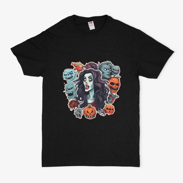 Een leuk t-shirt met een afbeelding een griezelige heks met pompoenen.