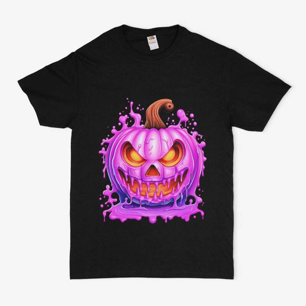 Een leuk t-shirt met een afbeelding van een griezelig gave neon pompoen.