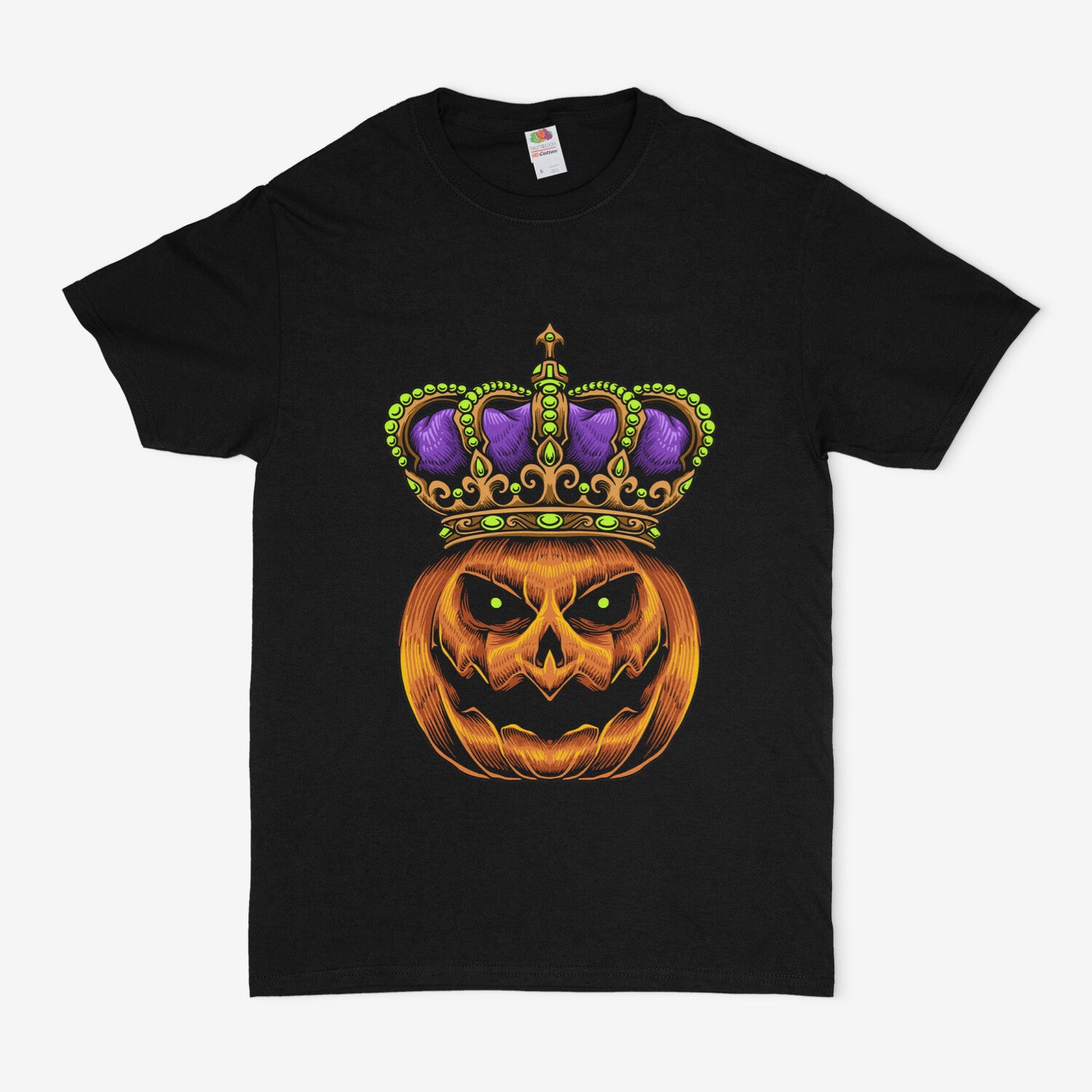 Een griezelig t-shirt met een afbeelding een enge pompoen met kroon.